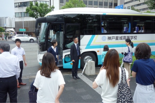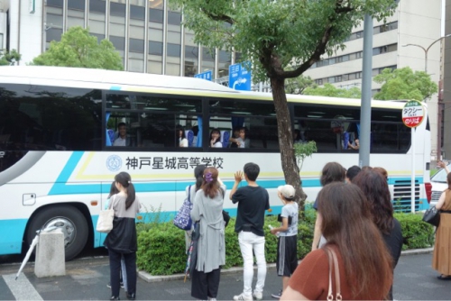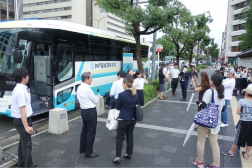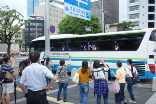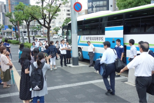 7月19日(金)15時、湊川神社前に集合した海外教育研修団60名は、いよいよアメリカへ向けて出発しました。生徒たちは初めての3週間の海外滞在、初めてのホームステイなど、不安と期待が入り混じる中、お見送りに来て頂いた保護者・家族の方に「行ってきます!」と笑顔で手を振りながら出発しました。バスは関西国際空港へ向かい、チェックイン後、海を越えてアメリカのサンフランシスコに到着します。生徒たちの活動の様子はホームページで随時紹介しますので是非ご覧ください。
