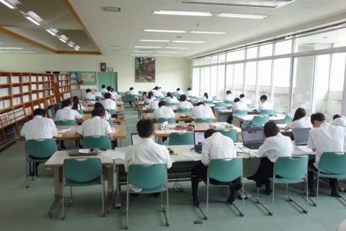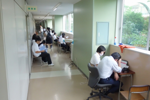 今日から8月に入りいよいよ夏も本番ですが、本校の大会議室では夏休みの間、毎日小論文講座が開講されています。本日も多くの3年生が自主的に参加し、過去問題に取り組みました。講座終了後も職員室前に並び、積極的に添削を受けにいく様子が見られました。またライブラリーでも「自学自習」と、自ら鍛える3年生の姿は頼もしささえ感じられます。