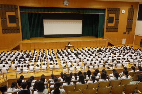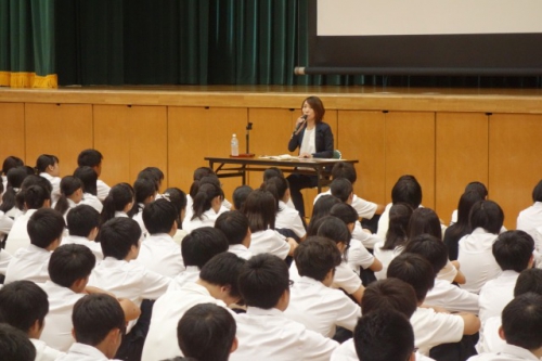 被害者支援についての話に続いて、「みなさんにとって大切な人は誰ですか」との問いかけから犯罪被害者遺族の坂口真弓さんの講話が始まり、残された遺族としてのご自身の体験から、本校生に「命の大切さ」を話していただきました。