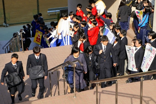 4月5日(水)入学式、通学路の満開の桜の下を、真新しい制服に身をつつんだ420名の新入生が登校してきました。期待と不安の新入生を出迎えるのは、中央階段に入部勧誘の看板を手にユニホーム姿のクラブ部員の笑顔と大きな挨拶の声です。