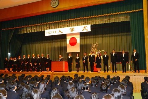 育友会代表祝辞、祝電・祝詞披露に続き新入生の宣誓がありました。その後、音楽部伴奏、生徒会・有志合唱による校歌斉唱で、入学式は終了しました。学校長より1年教師職員の紹介の後、新入生は担任引率のもと、各教室で高校生活初めてのホームルームをしました。