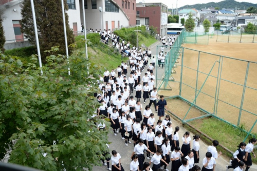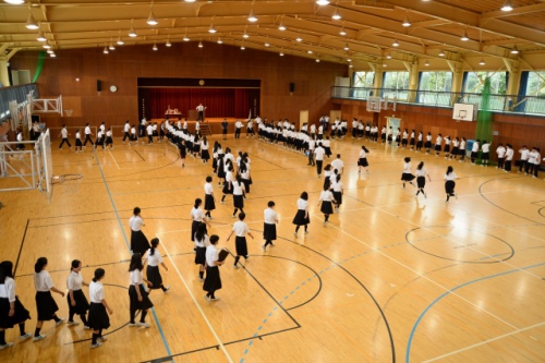 9月5日(木)、避難訓練・生徒会役員・学級委員任命式を行いました。避難訓練では、「震度5強の地震発生、その後、火災発生3号館2階カフェテリア厨房付近」を想定し、体育館に避難する訓練を実施しました。避難時に気をつけるべき点の「あ・さ・お・は・し」を注意し、避難開始から避難完了までは7分45秒と生徒たちは4月よりも1分ほど早く集合できました。