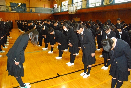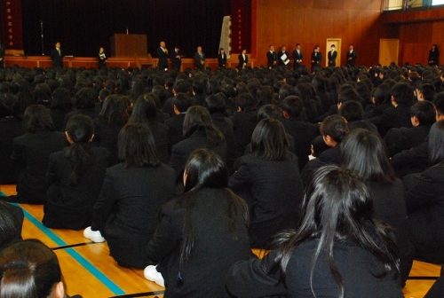 教頭先生の「開会のことば」に校歌斉唱の後、校長先生の「新年度を迎え、節目の日である始業式に、こうして元気に登校してくれてうれしく思います。おはようございます」との言葉に、全校生徒の大きな挨拶の声が響きました。