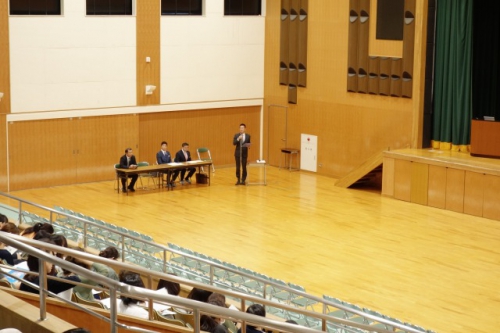 続いて進学指導部長より、本校からの進学についてご説明させていただきました。昨年度の本校からの進学状況、検定の取得状況、大学入試制度改革に関することや小論文における時事問題の知識の必要性など、具体的な内容が多くありました。最後には「大学生、社会人になってから活躍できるよう指導していきたい」と締めくくりました。