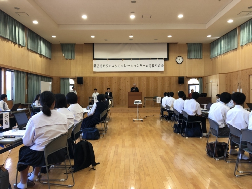 本校からはビジネス研究部1年生と有志の2年生で出場しました。1チーム3名程度で、商品売買業を営む会社の経営を行います。2年(計8四半期)終了時に剰余金が一番多いチームが優勝となります。各期ごとにチームで話し合いながら意思決定を行います。「販売価格」はいくらにするか、「仕入」は何個行うか、「従業員」を何人雇用するか、「教育訓練」「賞与」にいくら投資するか、「営業」はどこのエリアで行うかなど、各チームごと特色ある戦略を立てて意思決定を行い、決算結果を確認する度に歓喜の声や落ち込む姿が見られました。「銀行借入」で融資をいくら申請するか、手形割引をいくら行うか、損害賠償事故も発生するなど、実際の会社経営に通ずる内容を体験しながら、日頃学習している簿記の知識を実戦形式で活用しながら学ぶことが出来る貴重な経験でした。