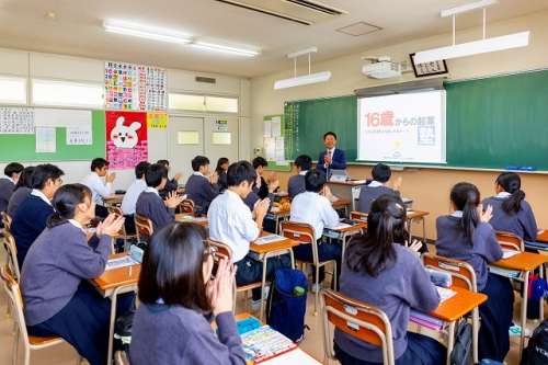 10月30日(水)の6時限目、一般社団法人関西ニュービジネス協議会の副会長で、八戸ノ里ドライビングスクールの代表取締役でもある谷岡樹氏に講師として引き続きお越しいただき、第4回目となる「16歳からの起業塾」というテーマの授業(全6回)が行われました。