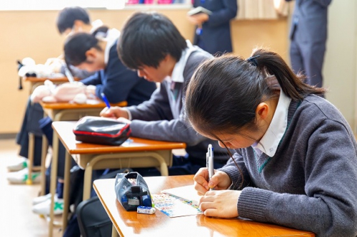 最後に、グリコの創業者である江崎利一氏の言葉「商売は2×2=5」を紹介され、「2×2が4なのは当たり前のこと。常にプラス1をして5にする事を考える。普段の生活からそのプラス1が出来るかできないかで、その後の結果は大きく変わる」、「これを学校生活に置き換えると、テスト前、受験前にいつもの2倍以上勉強することは当たり前のこと。日頃からプラス1のことができると大学の選択肢や将来への道が広がっていく」と自分たちにも今できることがあるのだと痛感させていただけるお話で締めくくられました。