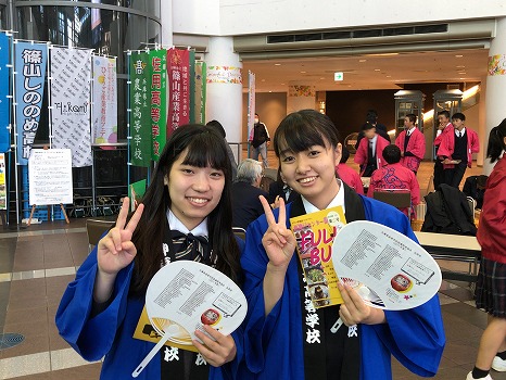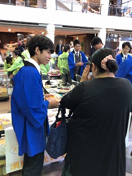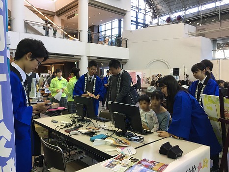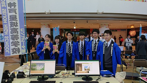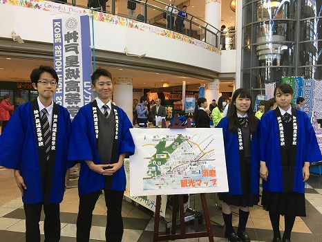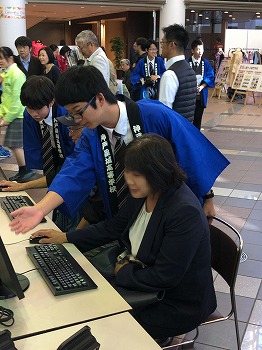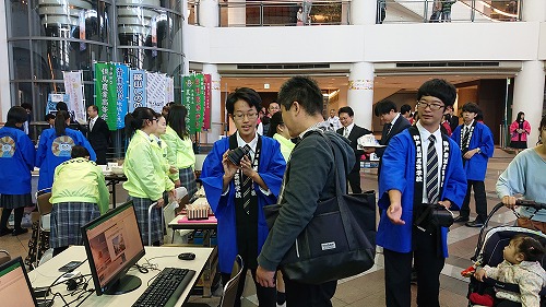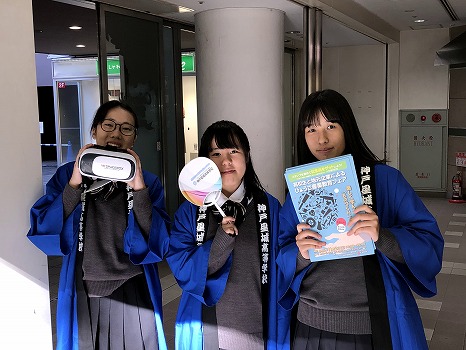入り口でお客様の確保・誘導をキャンパスナビゲーター部女子3名が担当し、大きな呼び込みの声が会場に響き渡っていました。メイン会場内の商業ブースで中心コンテンツとなった本校の展示として、コンピュータ部男女6名が「ExcelのVBAを駆使して作成したサウンドノベルゲーム体験」と「須磨観光マップ内のQRコードをスマートフォンから読み込んでVRゴーグルにセットして観光地を巡る3D体験」を担当させていただきました。多くの来場者に体験いただき、「Excelでこのようなことができるとは知らなかった」などの感想をいただくとともに、楽しんでいただくことができました。