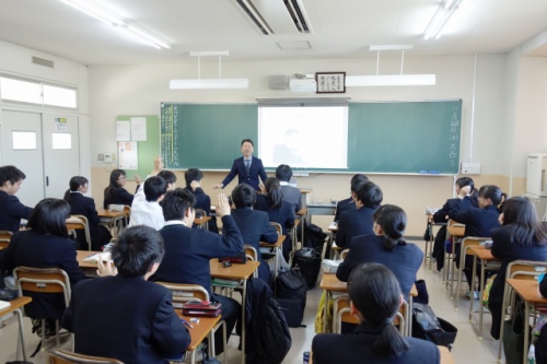 11月20日(水)の6時限目、一般社団法人関西ニュービジネス協議会の副会長で、八戸ノ里ドライビングスクールの代表取締役でもある谷岡樹氏に講師として引き続きお越しいただき、第5回目となる「16歳からの起業塾」というテーマの授業(全6回)が行われました。
