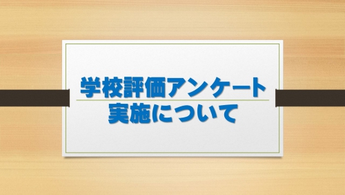 12/5にプリントを配布いたしました。本年度からスマ-トフォン及びパソコンからの入力に変更しました。プリントをよく読んでいただき、ご回答をいただき、12月22日(日)までに入力していただくようにお願いします。従来のアンケート用紙(記入方式)もありますので、必要な方は生徒を通じて学級担任にお申し出ください。ご協力よろしくお願いいたします。(なお、生徒対象のアンケートは、学年登校日に実施いたしました。)