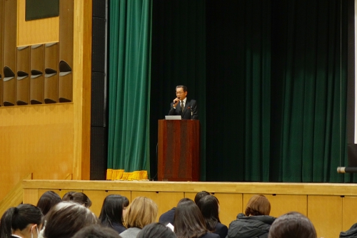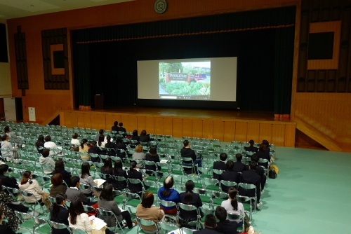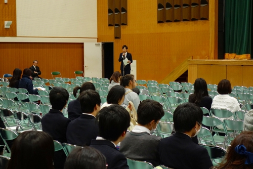 12月6日の午後、講堂で「第38回海外教育研修実施説明会」を行い、参加希望生徒・保護者合わせて約80名が出席されました。本校独自の海外教育研修の概要から、生徒による体験発表、海外教育研修に向けて生徒を対象に実施するオリエンテーションや、参加する上で必要な手続きなどについて説明を行いました。昨年度参加した生徒の体験発表では、実際に海外教育研修に参加した生徒がプレゼンテーション形式で自分の体験を発表し、参加希望生徒もリアルな体験談を聞くことで実感が沸いたようでした。