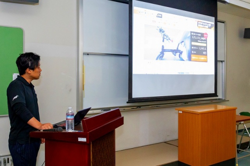 鳴海氏は最初にNHKがglafit株式会社を取材し放送された映像を流され、「クラウドファンディングを成功させてから、それを色々なところで取り上げてもらっているが、自分の長い歴史の中での2年間ぐらいの話で、ここにいきなり立ったわけではなく15歳からの積み重ねで今に至っている。皆さんと同じ学生時代にどういう事をしていたかというのを伝えて生きたい」との言葉で講演が始まりました。
