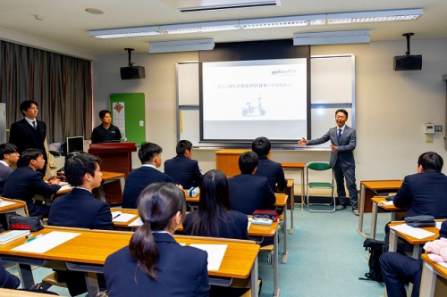 12月11日の13時~約90分間、起業家の講演会を行いました。これは特進Sコースの「経営者によるレクチャー」最終回(全6回)でもありますが、全学年の生徒も参加できる形で実施いたしました。講師として、クラウドファンディング資金調達額(1億2800万円)の最高記録を樹立された電動バイク「glafitバイク」の販売を手掛けるFINE TRADING JAPAN代表・glafit株式会社 代表取締役CEOの鳴海禎造氏にご講演いただきました。