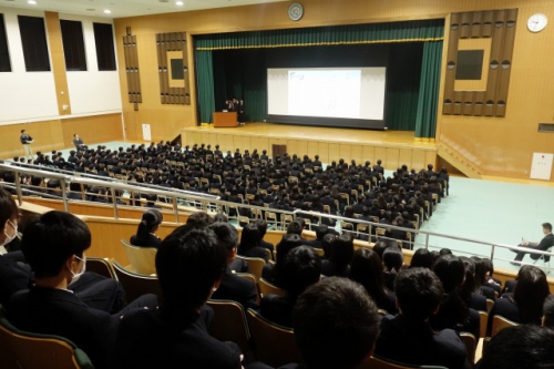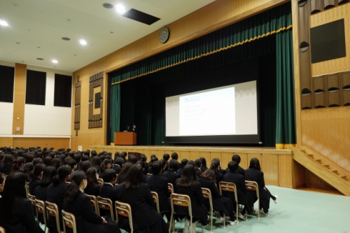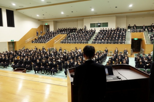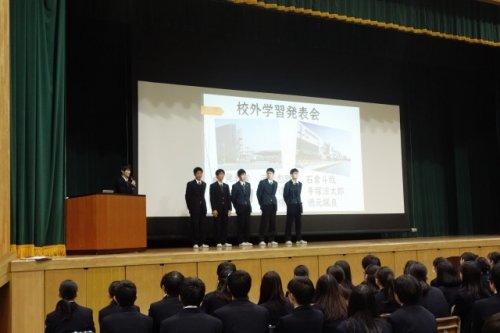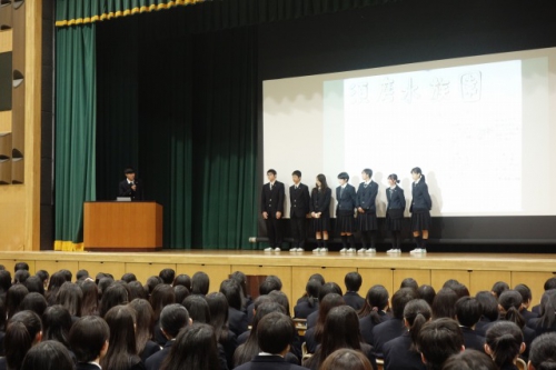 発表の後には、学年主任からの講話があり、「自分たちが経験したものを伝えるというのは如何に難しいか、それを身につけることが出来れば今後多くの場面で応用できる」「今日の発表の中には、教科書からは学べないことが多く盛り込んであった。これを通じて、得たものを高校生活にも繋げてほしい」といった話がありました。