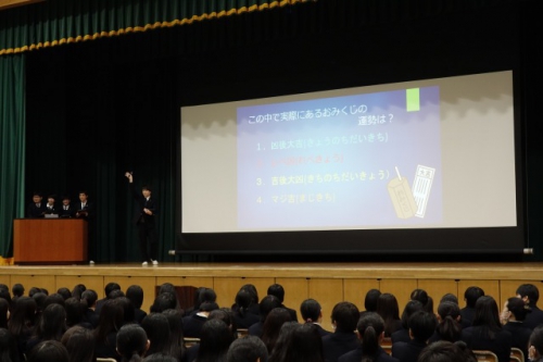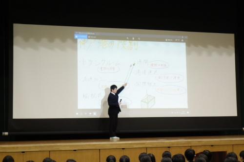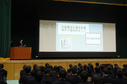 12月12日(木)1~3校時、1年生は各クラスで行った校外学習の現地調査・報告発表を行いました。11月6日に実施した校外学習は主に神戸市内で、各クラス自分たちがどんなことをするか考え、それぞれのテーマ(観光都市神戸の特徴・地域商店街活性化方法・防災学習など)を持って三宮などで実地調査やインタビューなどを行いました。その結果からプレゼンテーションを作成して、学年全体が講堂に集合しクラスの代表が発表を行いました。中にはクイズなどを取り入れ、ユーモア溢れる発表をしたクラスもありました。