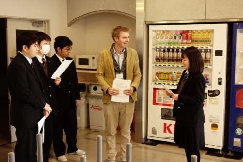 2日目は、引き続き実践的な英会話の練習や、友達の紹介、学校を紹介するプレゼンテーションなどを行いました。友達の紹介ではグループ内で二人組を作り、お互いをインタビューしてシートに記入し、それをもとに英語で紹介をしました。学校紹介のプレゼンテーションは構成や話す内容などを自分で考えて、実際に校内を英語で案内することで、英語力の向上を図りました。