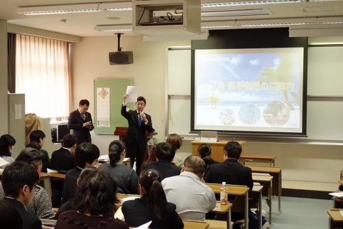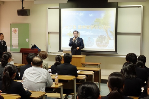 1月9日(木)の午後、特進Sコース1年生の生徒と保護者の方を対象に「セブ島語学研修説明会」を行いました。旅行会社の方にお越しいただき、セブ島の気候、現地校の校舎や食事、授業風景、ボランティア活動などについて、写真を交えながらわかりやすく説明していただきました。保険についてや出発からの詳しいスケジュール、現地校のスクールポリシーなど、細かい点についても資料と照らし合わせながら確認を行いました。