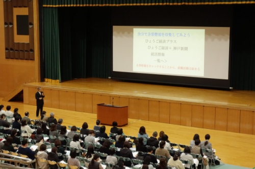 就職については、「2年生までは言われたこと、与えられたことをやってきたが、これからは自分からアクションを起こしていくことが必要になる」「今後行う就職講座や就職ガイダンスで、就職に対する意識を高め、自信をもって就職試験に挑んでもらいたい」といったことや、求人の流れ、指定校求人と公開求人の違いや校内選考会についてなど、具体的な内容を話しました。