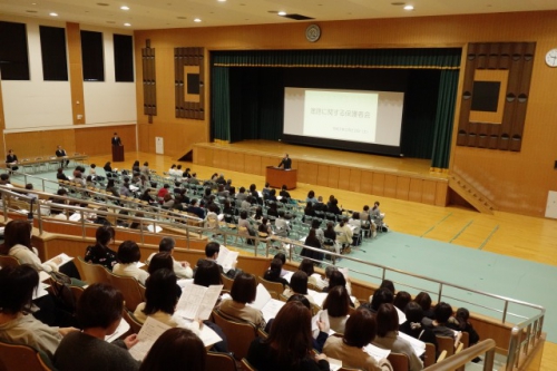 進学については、「令和元年度の進学状況・進学先の種類」、「選抜の種類と傾向・大学入試改革等」、「学習指導・志望校選択について」と幅広く説明を行い、特に大学入試改革によって変わった部分に関しては詳しく解説を行いました。また学習指導について、「ライブラリーを中心とした自学自習指導を積極的に行っていく」「小論文対策として、普段から新聞やニュース、ビジネス系番組などに目を向けてほしい」などの話もありました。