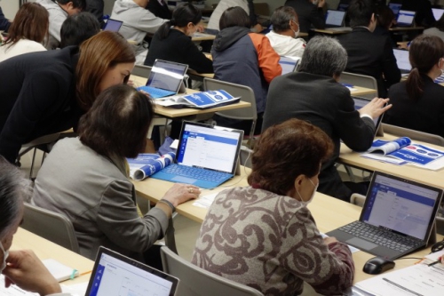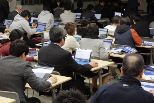 約2時間にわたって行われた説明の中で、スタディサプリ教材の全体像から、それを使いどうやって学力を身に着けていくか、実際の活用事例を紹介する動画などを交えながらお話をいただきました。最後は実際にパソコンを操作しながら使い方について解説していただき、生徒情報の確認、講義動画の確認、新しいクラス(グループ)の作成方法などの基本的な使い方から、宿題配信やメッセージ送信などの機能を活用する方法についても教えていただきました。