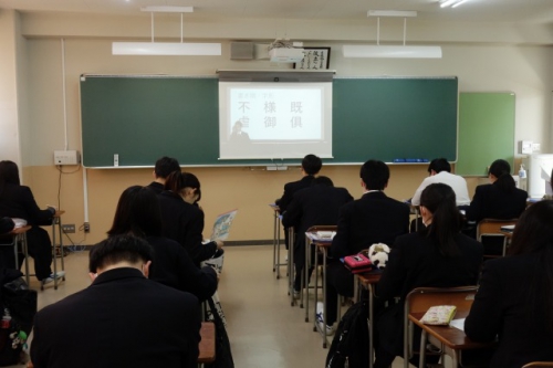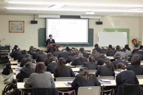 3月12日に予定されていた第1回小論文講座が臨時休校で延期となったため、終業式が行われた19日の午後に1回目の講座を開講し、新3年生を対象とした小論文講座がスタートしました。今年も昨年同様、進学希望の生徒の人数が多いため、大会議室と別の教室に分かれ、大会議室での講義内容をプロジェクターに映しての中継授業となりました。始業時の挨拶から引き締まった空気となり、受験生としての自覚を高めました。