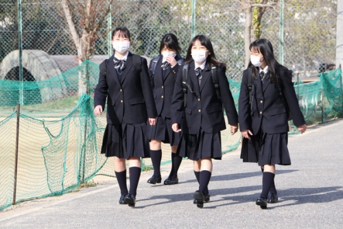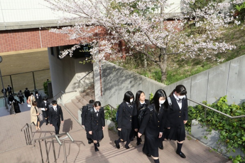 通学路の満開の桜の下を、真新しい制服に身をつつんだ新入生が登校してきました。教職員が拍手で迎える中、担任の先生の引率で全員出席の新入生388名が体育館に入場し、入学式が始まりました。本来であれば保護者の方にもご参列いただく予定でしたが、コロナウイルスの感染拡大防止のため、全員がマスク着用の上、新入生と教職員のみで行いました。