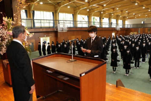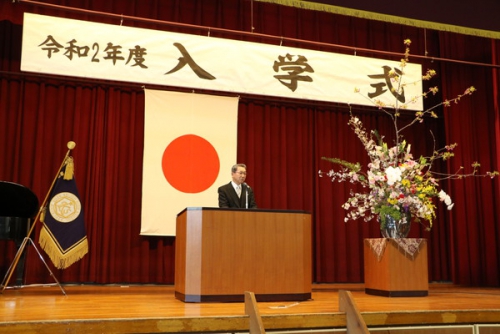 「新入生に保護者の皆さん、入学おめでとうございます。桜の花や春の花々が美しく咲いている本日ここに、新入生の皆さん388名を迎えて、令和2年度の入学式を、保護者の皆様にご参列いただけない中ではありますが、挙行できますことを誠にうれしく思います。