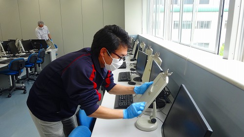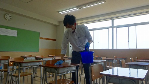 5月26日(火)、明日からの登校日や6月1日からの学校再開に備え、教職員で校舎各所の消毒作業を行いました。各教室の机や椅子、ドアノブ、パソコン教室のPC機器、階段の手すりなど、生徒や職員、外来者が触れる可能性の高い箇所を重点的に消毒しました。また各教室では机と机の間隔を広げ、ソーシャルディスタンスを確保するなど生徒の安全対策にも努めました。