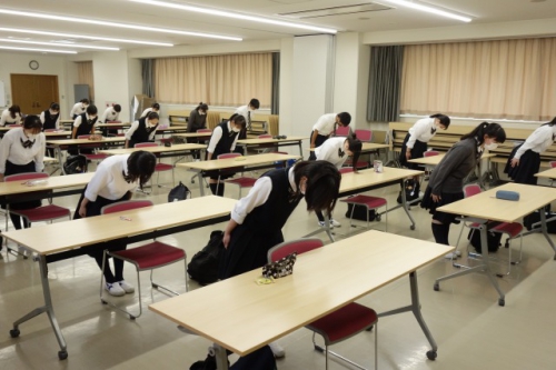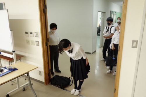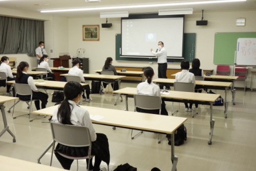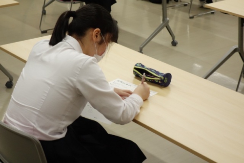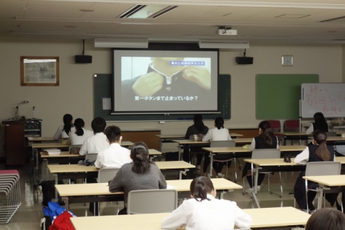 今回の講座では、最初にチェックテストを行った後、面接の受け方について映像を見ながら学びました。上映された映像は、面接中のマナー、面接前の控室での待ち方、入退室の仕方、面接中の話し方や態度で気を付けることなどについての内容でした。映像の後には進路指導担当教諭から「就職試験では必ず面接があり、何よりその面接結果で採用が決まるといっても過言ではない」「面接で大事なのはうまく話すことではなく、どれだけいい印象を残せるかどうか」という話もありました。