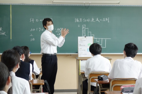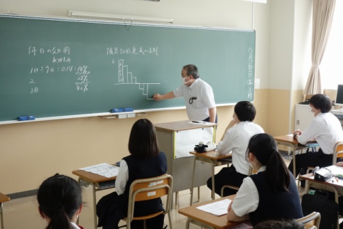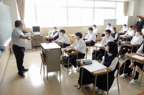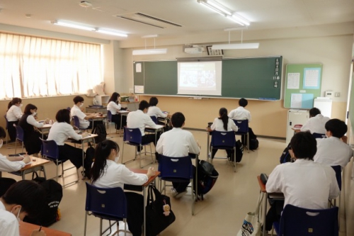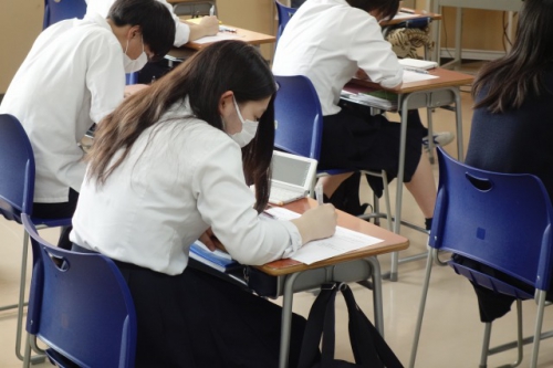大学進学を目指す3年生を対象に、休校中の遅れを取り戻すために毎週土曜日にも小論文講座が実施されています。今回は知識を身につけることが狙いで、日本経済史について約2時間の授業を行いました。分散登校のため、約半分の119名が各教室に分かれて、熱心に取り組んでいました。
