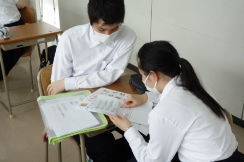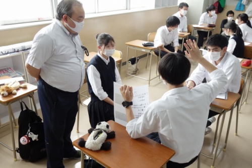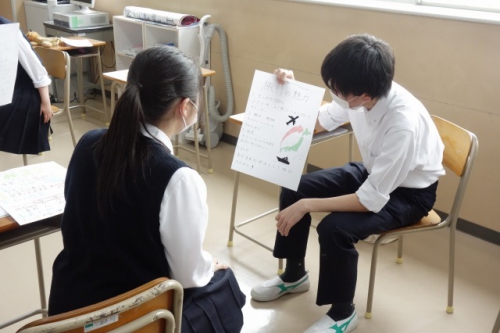 また、特進Sコースの2年生は課題研究の学習として、休校期間中に生徒自身が決めた題材でポスターを作成していましたので、それを教室で1人ずつ発表しました。これは欧米の学校で一般的に行われている「Show and Tell」と言われるもので、自分の好きなことや興味のあることについて話すことから、より自信を持って喋ることができ、質問にも答えやすくなります。実際に今日の発表でも、全員の生徒が聴いている全員に聞こえるように話すことができていたり、ほかの人が興味を持ってもらえるように様々な工夫をしていたりと、積極的に取り組んでいる様子が見られました。また、発表の後には質問の時間を作ることで、話す力だけでなく聴く力も高めました。今後ますます増えるプレゼンテーションを行う機会に向け、自信を育んだ1日になりました。