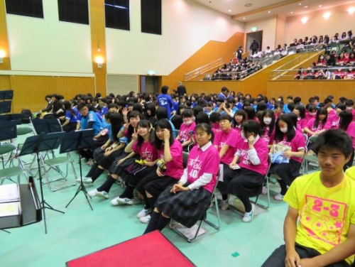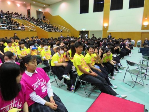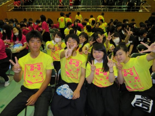 開会式は雨天のため、放送で行いました。校長先生のごあいさつの後、模擬店のコマーシャル10秒CMが行われました。中にはユニークなものも多く、生徒たちの笑いを取り盛り上がりを見せていました。