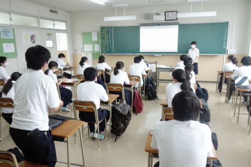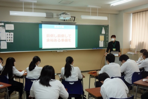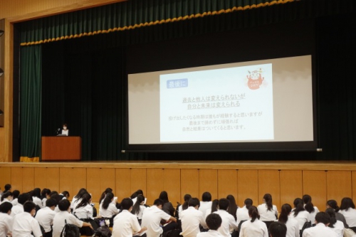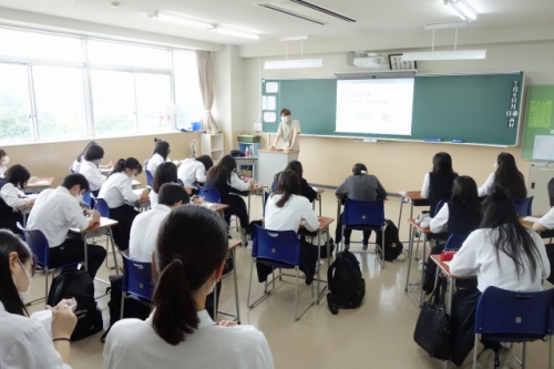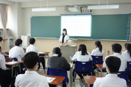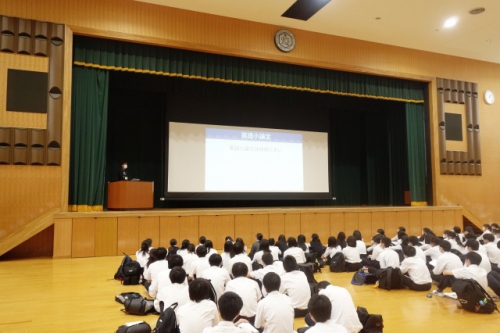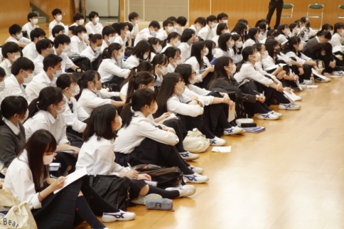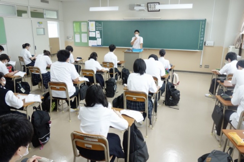 また、同日には3年生を対象に、本校の卒業生が自分の進路体験談を語るセミナーも行われました。体験談を語ってくれたのは、和歌山大学、鳥取環境大学、下関市立大学、京都産業大学、香川大学、滋賀大学、高知大学、広島大学で学んでいる大学生9名の卒業生たちでした。高校時代に頑張っていて良かった話や、大学生になって初めて気付いた話などがあり、「受験と部活の両立は、きちんとメリハリをつけ、切り替えることが大事」「志望校の事などで悩んでいると、勉強が前に進まない。何事も早め早めに準備をする」「結果がどうであれ、その経過で得られるものは必ずある」など、具体的なアドバイスや助言が多くありました。卒業生の体験談は3年生にとって、今の自分の意識を高めるとともに、自分を変える大切な一日になったことでしょう。講話していただいた先輩方、ありがとうございました。