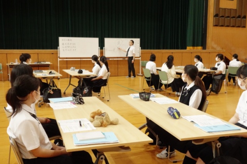 8月1日(土)、「就職ガイダンス」が講堂で実施され、就職を希望する50名の3年生が参加しました。9時30分から外部講師3名をお招きし、「就職力をつけるワークブック」を参考にガイダンス実習が始まりました。