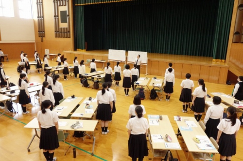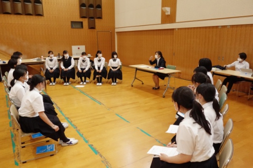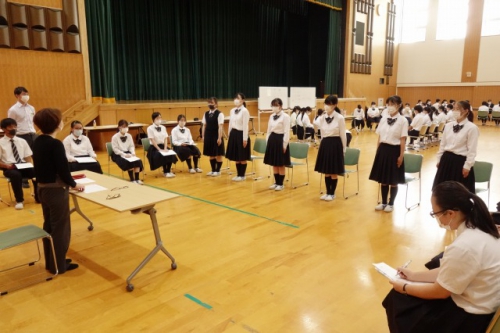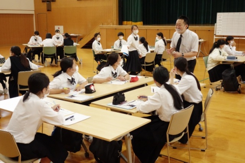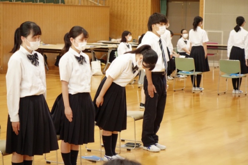 ガイダンスは今年度の就職状況についての話から始まりました。「高校新卒者には何が求められるか?」という話では、実際に高校生の採用で重視されていることの1位である「コミュニケーション能力」は話す力だけでなく、聴く力が重要であると話されました。また面接時には笑顔やマナーといった目に見える第一印象が重要であることを踏まえて、生徒たちは第一印象をよくするための立ち方・座り方、笑顔の作り方や身だしなみを教わりました。採用する側の立場から就職について考えるために、グループワーク「会社づくりゲーム」も行いました。社長・秘書役などに分かれ、採用される者に必要な強みや能力を学びました。