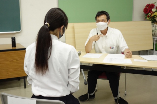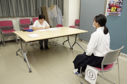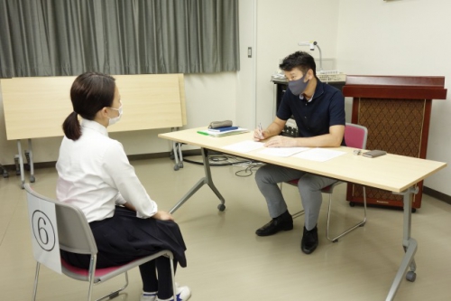2学期が始まってしばらく経ちましたが、3年生にとってはいよいよラストスパートを迎える時期で、進学・就職に向けて必死に取り組んでいます。本日9月3日(木)の放課後には就職希望者を対象に就職模擬面接があり、面接官役の先生を前に一対一での模擬面接に挑みました。模擬面接の終了後には面接官役を担当した先生からのフィードバックを聞き、客観的な意見を参考にしながら自身の改善点を確認していました。