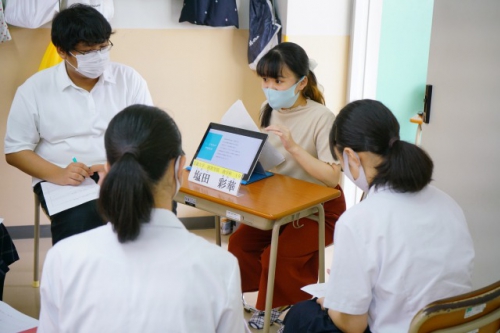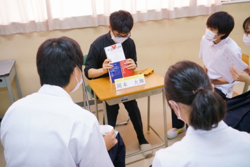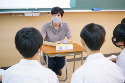 広島大学・近畿大学・神戸市外国語大学・大阪市立大学・一橋大学大学院に通っている5名の卒業生が本校まで足を運んでくれ、進路に向けて取り組むべきことや合格するための勉強方法など、自らの経験談を交えながら語ってくれました。それぞれプレゼンテーションの後、卒業生ごとにブースを作り、生徒は5グループに分かれて直接質問などをしながら話を聞きました。