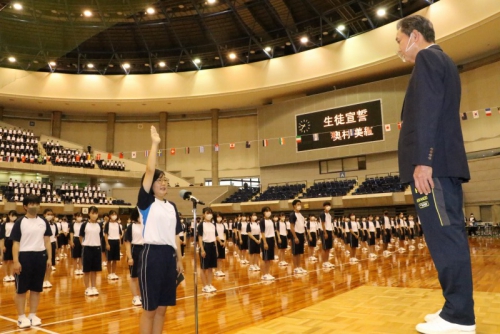 「今年は新型コロナウイルスの影響で多くの行事が実施できていませんが、今日こうして体育大会を行うことができてうれしく思います。毎年体育大会を行って思うことは、体を動かすことの大切さです。特に今年は外出の自粛が要請され、運動不足の人も多いと思います。今日の体育大会を通して、スポーツをしたり体を動かすことで、健康な体作りに取り組むことの大切さに気付いてもらえたらと思います」との、校長先生の言葉で体育大会が始まりました。