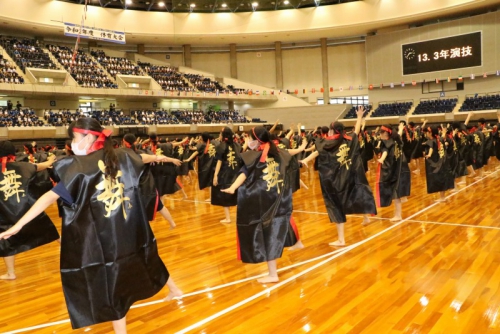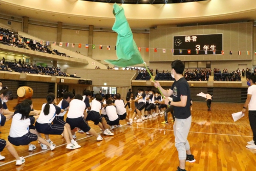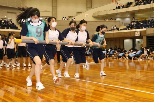 午後の部はクラブ対抗リレーに始まり、背渡り競走、宅配便リレー、台風の目リレー、学年対抗リレーと、走る生徒も応援する生徒も一つになりました。コロナ対策のため内容も昨年と違う演技もありましたが、会場を沸かせる楽しい内容ばかりでした。クラブ対抗リレーでは、大激戦の結果、女子の部が女子ソフトボール部、男子の部は陸上競技部が1位となりました。そして綱引きの後は、3年生の学年演技が行われました。学年演技はすっかり本校の名物になった「ソーラン節」です。3年生全員、背中に黄金に輝く「舞」の文字が刻まれたハッピを着て、息の合った「ソーラン節」を演じ切りました。