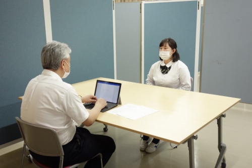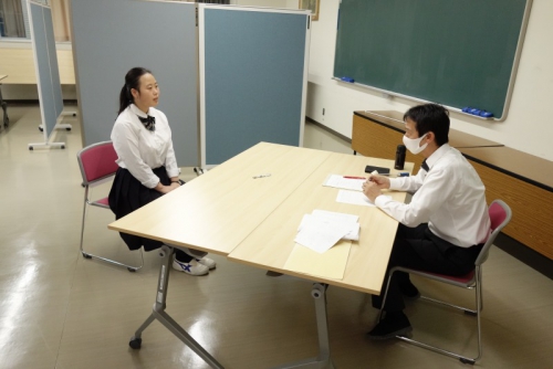 先日土曜日には3年生の進学希望者を対象に、外部の講師にお越しいただき模擬面接を行いましたが、就職希望者も日頃から面接練習に取り組んでいます。9月29日(火)の放課後には先生が面接官役となって1対1の面接に挑み、生徒それぞれの改善すべき点について様々なアドバイスを受けました。