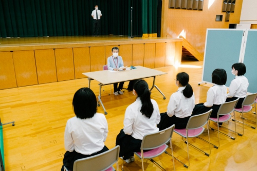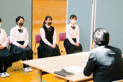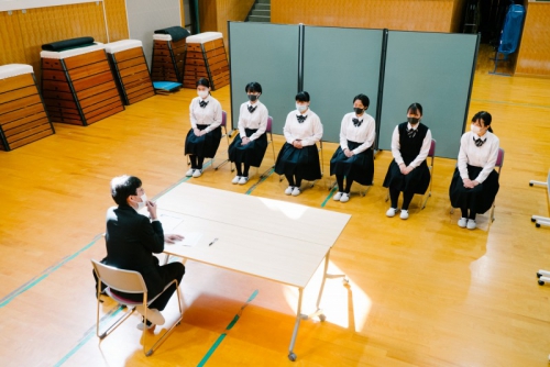 そして本日10月3日(土)には外部講師4名をお招きし、講堂にて模擬面接会を行いました。生徒は本番さながらの雰囲気の中で緊張感をもってグループ面接に挑戦し、入室から退室までの中で、姿勢や身だしなみ、喋り方や受け答えなどについて評価を受け、そのフィードバックをもとに自分の面接を振り返りました。