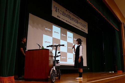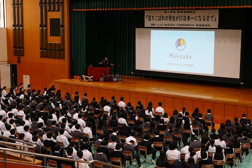 10月7日(水)の5・6校時に、経営者講演会を行いました。特進Sコース生は年6回の「経営者によるレクチャー」を受講していますが、今回は1年生全コースを対象に実施いたしました。講師として、クラウドファンディングサイト「Makuake」にて初の1企業のプロジェクトが連続で1億円超えという快挙を達成した電動バイク「glafitバイク」の販売を手掛けるFINE TRADING JAPAN代表・glafit株式会社 代表取締役CEOの鳴海禎造氏に『落ちこぼれの学生がCF日本一になるまで』と題してご講演いただきました。
