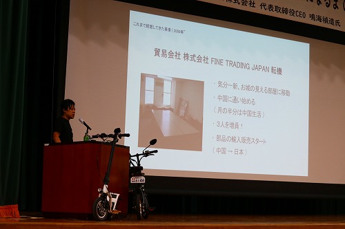 今回の講演会は、鳴海氏が新作のglafitバイクで颯爽と登壇されるシーンから始まりました。講演は鳴海氏のこれまで経営してきた事業を3つの章に分けてお話くださいました。