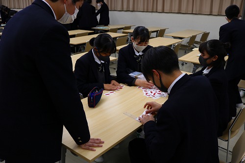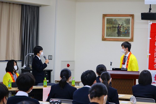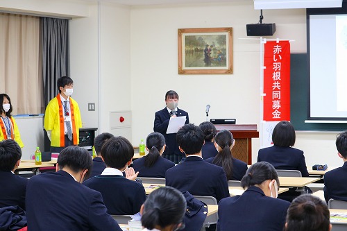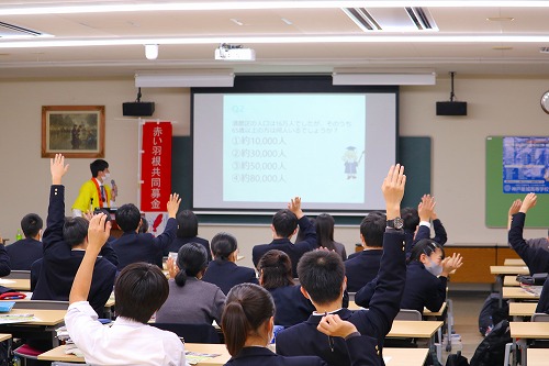 11月16日(月)の放課後に生徒会12月ボランティア企画「赤い羽根共同募金ボランティア活動の福祉学習&事前ミーティング」を生徒会と1・2年有志生徒51名で行いました。