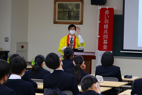 本日は、社会福祉法人 神戸市須磨区社会福祉協議会の足立様に「赤い羽根共同募金」について講演していただきました。今回の講演では、時折クイズを交えながら、赤い羽根共同募金の歴史や集まった募金の使い方などについて説明を受け、活動意義を学ぶ、福祉学習の機会となりました。