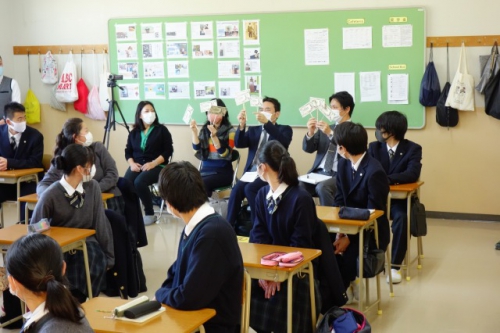 今回の授業では、前回のグループワークで考えたビジネスプランの発表を行いました。3名の経営者の方にお越しいただき、生徒が考えたプランに出資してもらうことを想定して、合計いくらの出資が得られるかをグループで競いました。