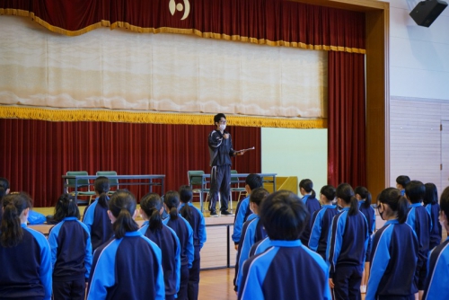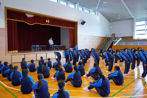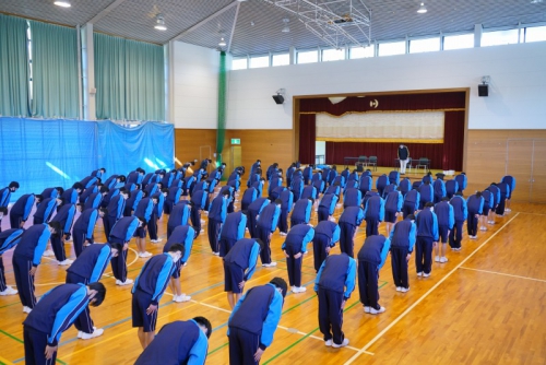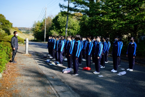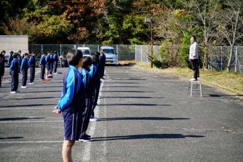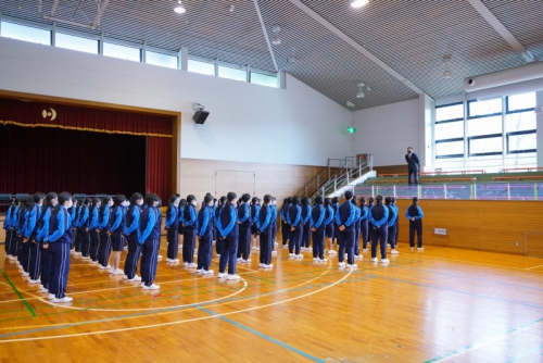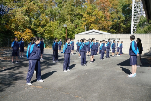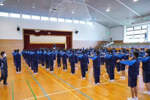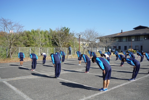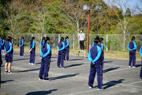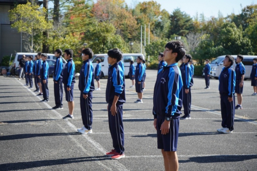 最初にその日参加した生徒全員が体育館に集合し開会式が行われ、続けて礼法・声出し・校歌の練習に励みました。全体練習の後は外でクラスごとに分かれて練習し、最後に1クラスずつ練習の成果を披露しました。