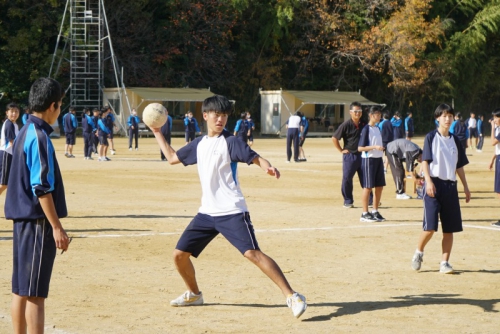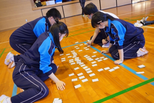 昼食を終え、午後からはグラウンドでの球技大会や体育館での百人一首など、レクリエーションが行われました。球技大会では担任やクラスメイトから熱い声援が送られる中、楽しく汗を流しながら全力投球し、百人一首は1枚でも多くの札を取ろうと、白熱した戦いを繰り広げていました。