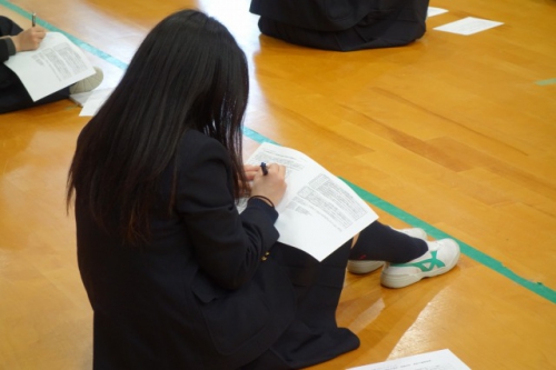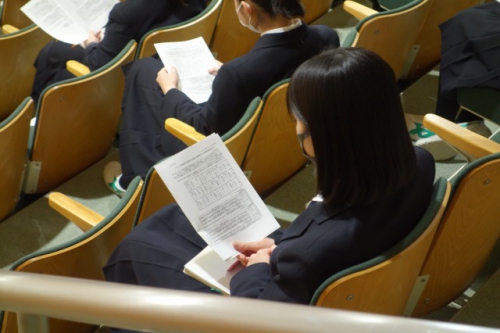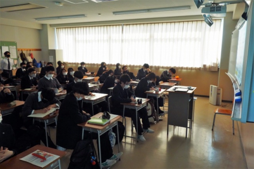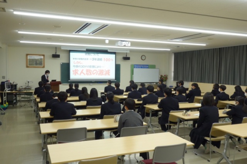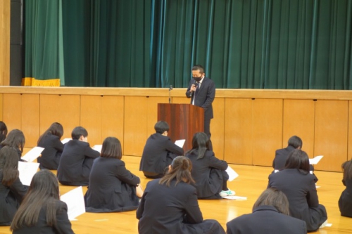 先生からは選択科目についての説明の中で、「友達が行くからなどの理由や、消去法で選ぶの ではなく、しっかりと自分の意志で本当にやりたいと思う科目を選んでほしい」といった話がありま した。また、進学・就職に向けた詳しい説明、今後のスケジュールやこれから取り組んでもらいたいことなどについても話があり、この4月から3年生となり、自分の目指す進路に向けて本格的に 取り組むためにも、自分の今後を考えるいい機会となりました。