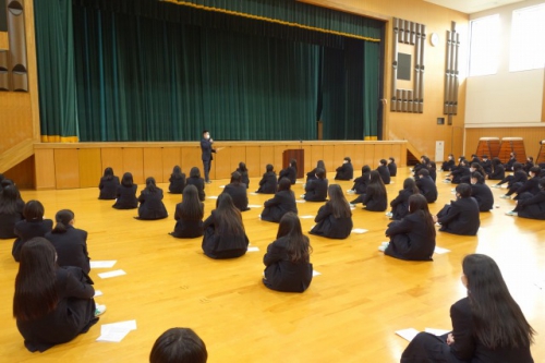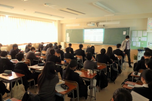 1月27日(水)の5・6校時に、キャリアコースと特進A・Bコースの生徒対象に、新3年生の選 択・課題研究科目の履修についての説明会を行いました。それぞれ科目担当から開講予定科目 の内容説明がありました。